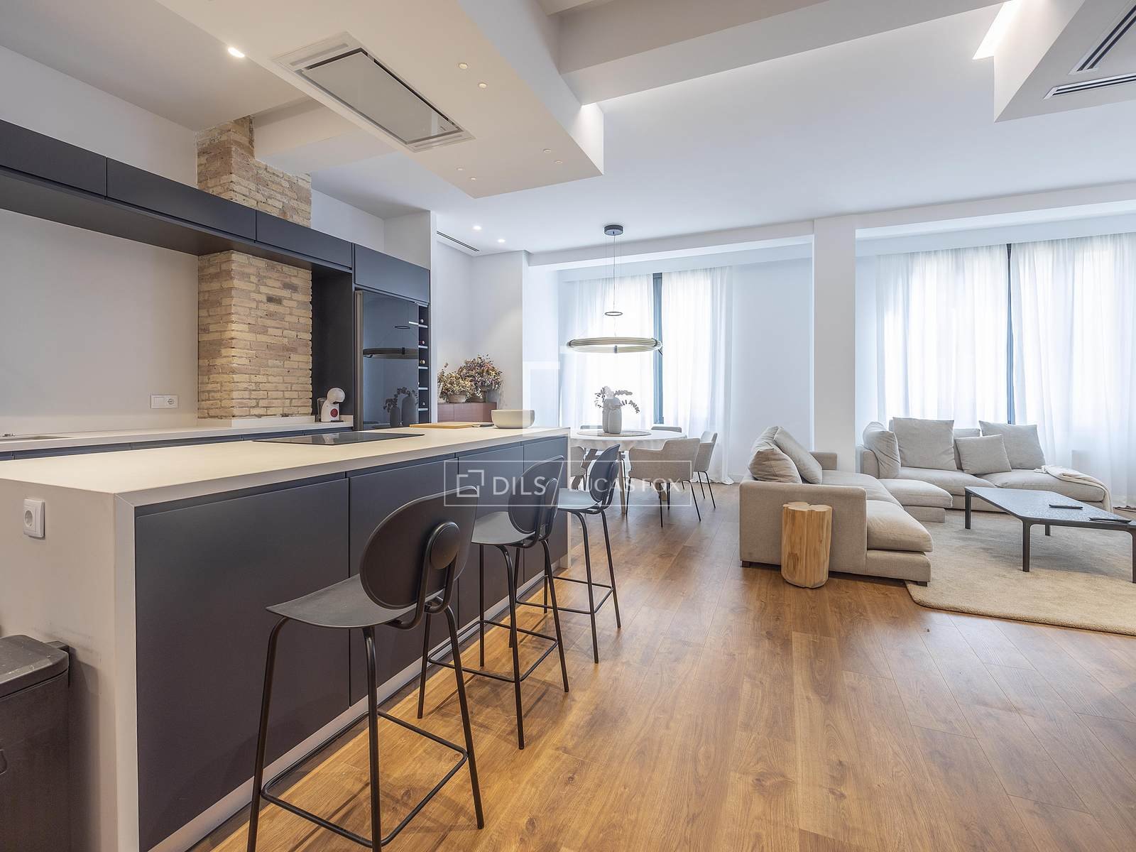 Al entrar, accedemos directamente al espacioso salón-comedor, con dos grandes ventanales a la calle. Desde aquí, disfrutamos de maravillosas vistas panorámicas a las zonas arboladas de los Jardines del Turia. La cocina, abierta al salón, cuenta con una gran isla central y amplios muebles negros mate. Cuenta con una amplia encimera y electrodomésticos integrados de alta gama. La zona de día es excepcionalmente soleada gracias a los altos techos de la propiedad, sus amplios ventanales y su favorable orientación sureste.